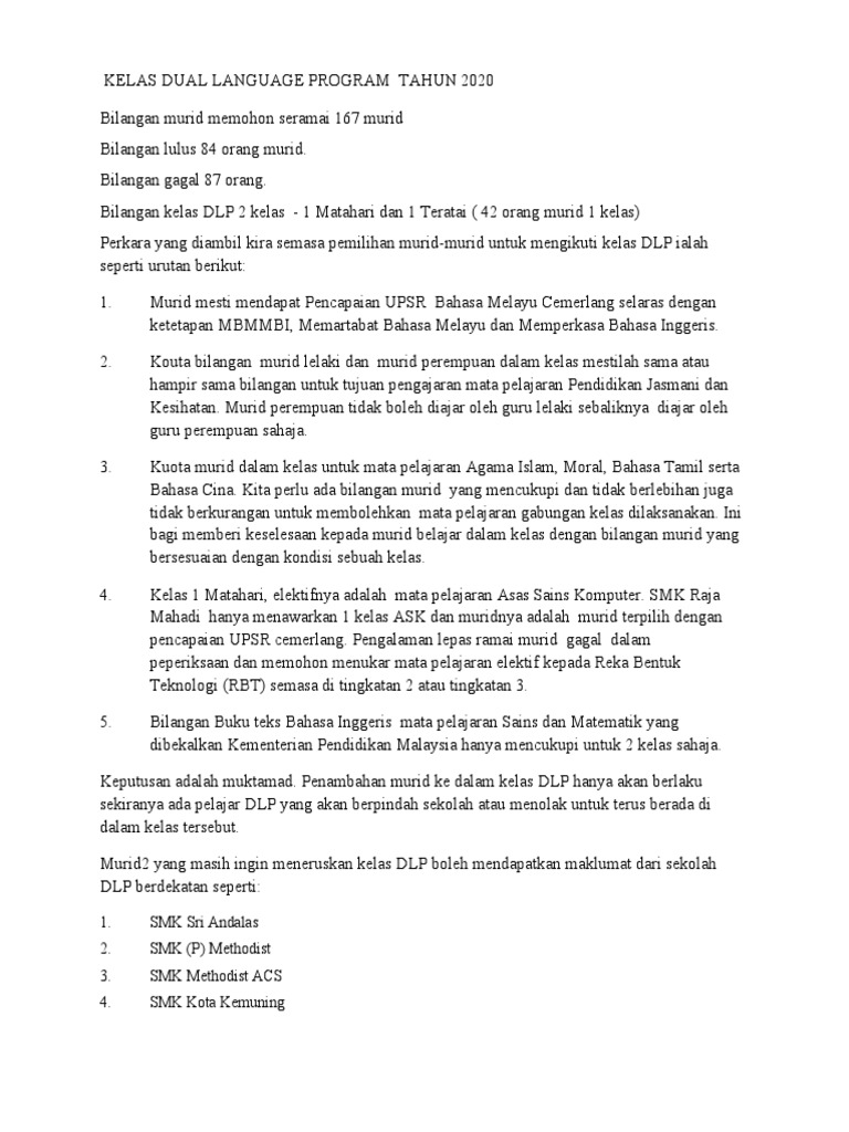 It provides the same academic content and addresses the same standards as other educational programs. You are very lucky for this opportunity. 2.1 dlp merupakan program yang memberi pilihan kepada sekolah untuk menggunakan bahasa inggeris dalam pengajaran dan pembelajaran (pdp) mata pelajaran. Umum sedia maklum, program dwibahasa atau dual language programme (dlp) adalah satu program di bawah ia dilaksanakan di sekolah kebangsaan dan sekolah menengah kebangsaan kementerian pendidikan malaysia (kpm) secara rintis pada tahun 2016 melibatkan 300 buah sekolah. Pending program capacity and screening results, you will receive a program acceptance or denial letter before the first day of school.