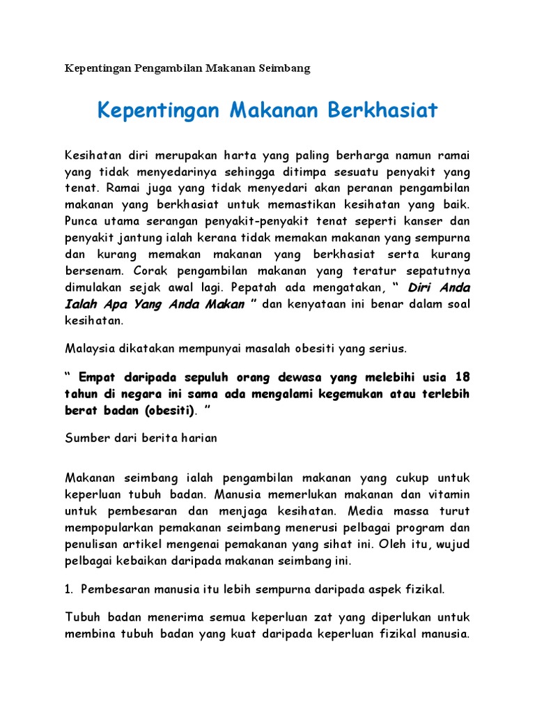 Amalan pemakanan sihat other contents: Antara kepentingan pengambilan makanan yang seimbang ialah: Piramid makanan,tunjang perkembangan fizikal dan estetika prasekolah: Manusia memerlukan makanan dan vitamin untuk pembesaran. Manusia memerlukan makanan dan vitamin untuk pembesaran dan menjaga kesihatan. Kepentingan pengambilan makanan sihat pend. Makanan seimbang ialah pengambilan makanan yang cukup untuk keperluan tubuh badan. Berikut adalah kepentingan pengambilan makanan seimbang Makan megikut pyramid makanan adalah lebih mudah. Kesan pengambilan makanan yang tidak seimbang menyebabkan tubuh badan memperolehi gizi yang tidak seimbang. Manusia memerlukan makanan dan vitamin untuk pembesaran dan menjaga kesihatan. Kesimpulannya, kita perlu mengambil makanan yang seimbang kerana semua kepentingannya sudah dinyatakan tadi. Pengambilan makanan yang cukup untuk keperluan tubuh badan mesti dirancang dengan satu gizi seimbang.