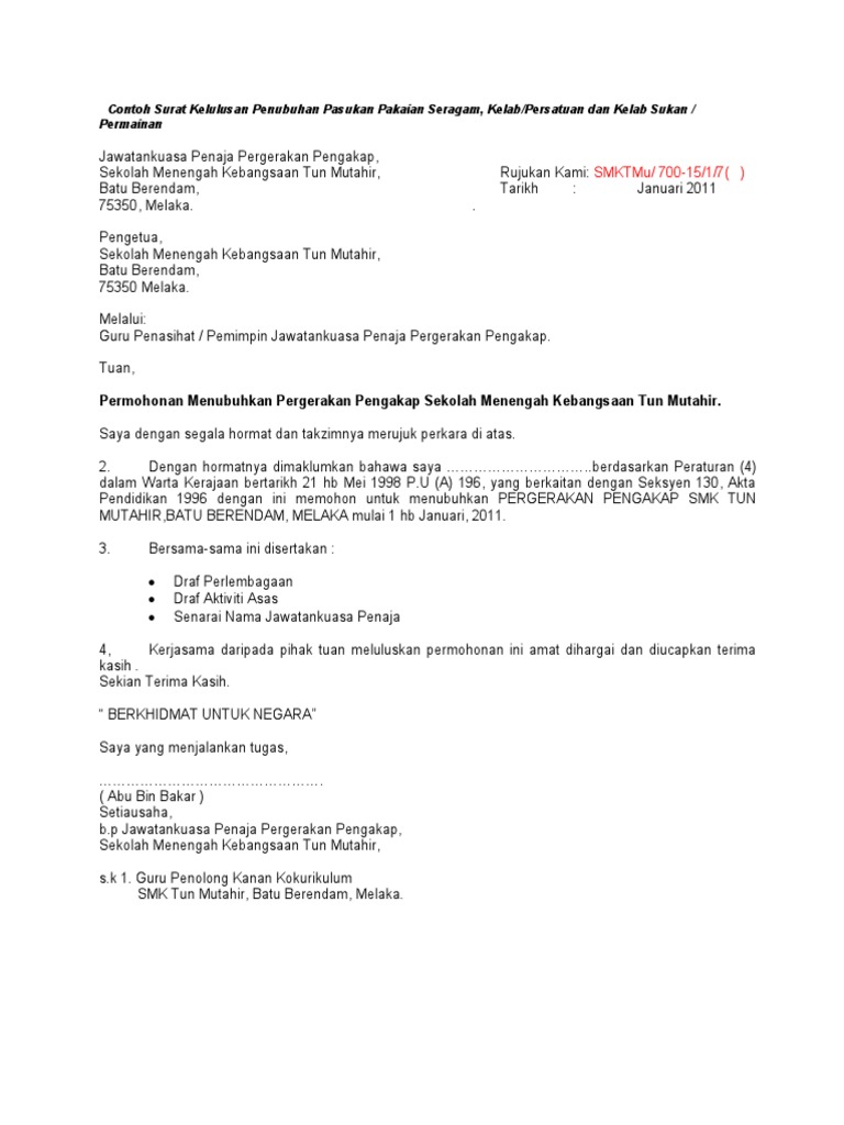 Doc Surat Permohonan Penubuhan Pasukan Pakaian Seragam Ong Kwee Leng Academia Edu from 0.academia-photos.com Adapun surat permohonan sendiri ada yang bersifat resmi atau pun sebaliknya tidak resmi. Demikian surat permohonan ini saya buat, semoga bapak/ibu dapat memaklumi dan berkenan memberikan izin. Suratresmi.id » surat permohonan » 15 contoh surat permohonan cuti paling lengkap. Ja#ar$ ja#ar$ !015 pengetua% smk baru bintulu peti surat 1547 jalan kemunting kemunting 97010 bintulu% sara&ak puan% permohonan penubuhan persatuan. Sebagaimana mestinya surat permohonan ini adalah surat yang sifatnya resmi dan untuk membuat surat ini sulit. Karena surat permohonan bersifat resmi maka dalam pembuatannya pun tidak mudah. 1 (satu) jepit hal : Kursus kelab dan persatuan pismp ipg kampus bahasa melayu.