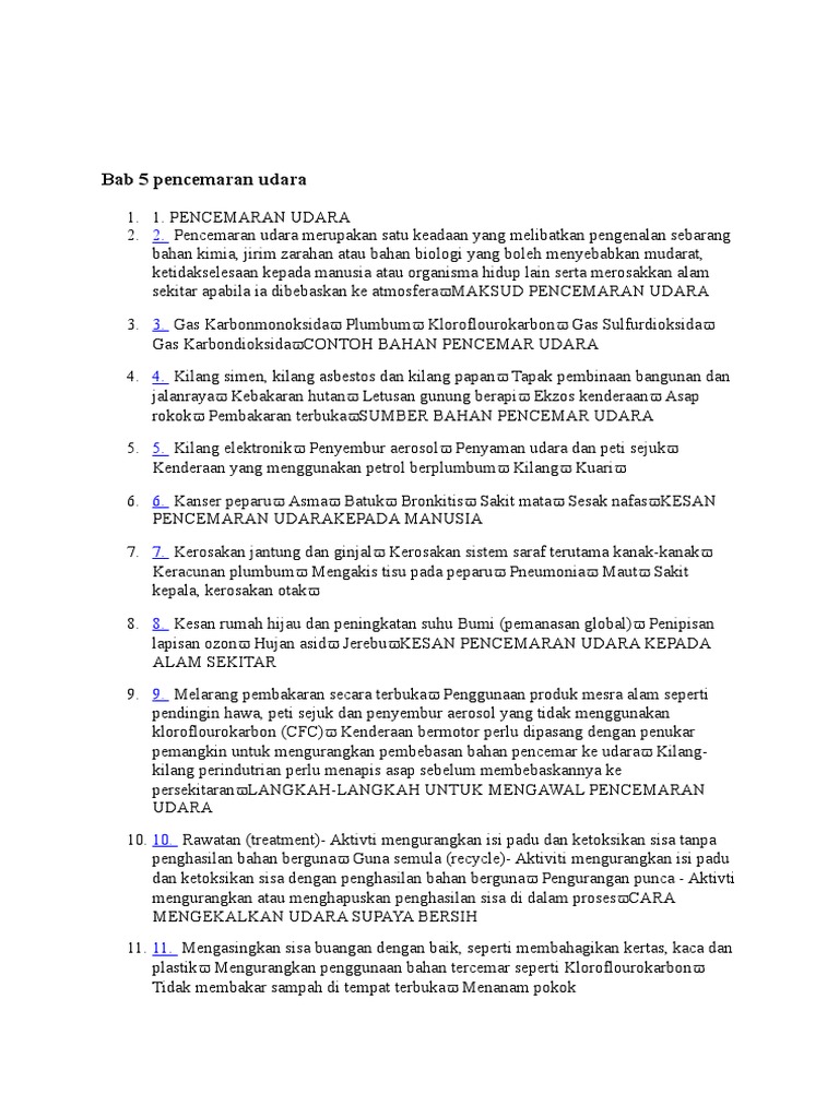 Uji Pencemaran Udara Oleh Partikulat Debu Di Sekitar Terminal Lebak Bulus Berdasarkan Bioindikator Stomata Pada Tanaman Glodogan Polyalthia Logifolia from data03.123doks.com Pencemaran udara merupakan satu keadaan yang melibatkan pengenalan sebarang bahan kimia, jirim zarahan atau bahan biologi yang boleh menyebabkan kemudaratan , ketidakselesaan kepada manusia atau organisma hidup lain serta merosakkan alam sekitar apabila ia dibebaskan ke. * kesan fisiologi melibatkan kehilangan pendengaran dan respons kepada keadaan cemas. Pencemaran udara berpunca daripada pelepasan asap kotor oleh industri terus ke udara melalui cerobong asap kilang, kenderaan motor di jalan raya dan letusan gunung berapi. Lebih daripada 70 peratus planet kita diseliputi air.tidak sampai 1 peratus. Menurut sumber pencemaran alam sekitar, siri pencemaran alam, jasiman ahmad eddiplex sdn bhd juga mengatakan bahawa pencemaran udara boleh dibahagikan kepada dua iaitu pencemaran udara primer dan pencemaran udara sekunder. Pencemaran udara dapat disebabkan oleh sumber alami ataupun kegiatan manusia. Penyebab pencemaran udara bisa karena faktor alami atau kegiatan manusia. Pencemaran air salah satu kesan yang berbahaya kepada takungan air dan laut.
